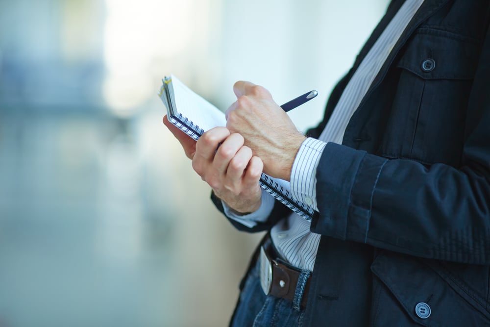 She saw Tom walk up to the group of people, take out a notebook from his breast pocket, and start writing things down. As she stared at them, she noticed Tom talking to these people pretty seriously.