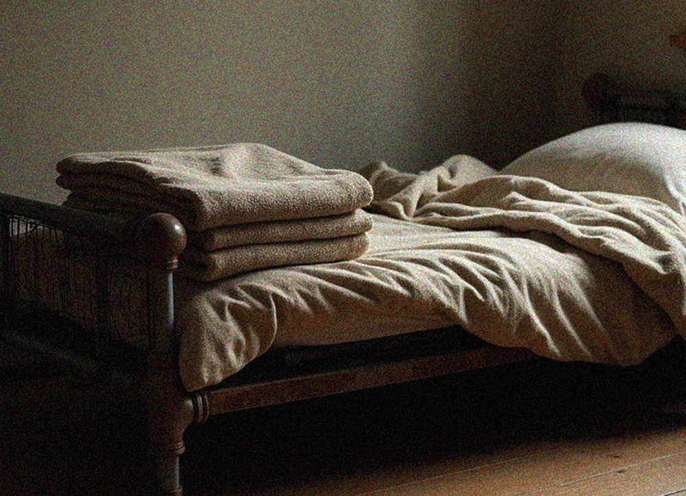 In the far corner, a small stack of blankets rested atop what looked like a makeshift cot; its frame was fashioned from pipes and wire mesh.