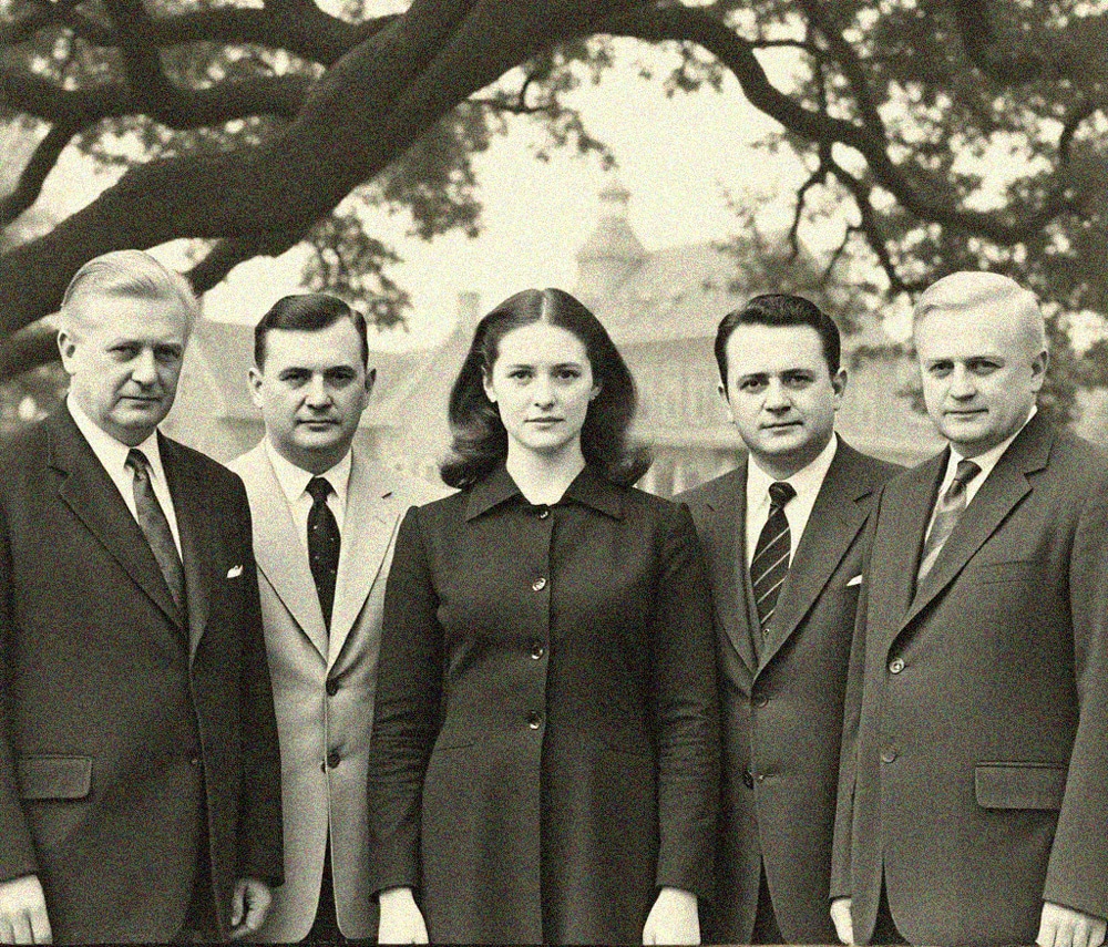 Inside the box was an old black-and-white photograph. A young woman stood in the center, framed by a large oak tree. Amber gasped. “That’s our backyard. That tree’s still there.” The woman looked solemn, and beside her stood four men in suits, faces blank, eyes cold. None of them smiled.