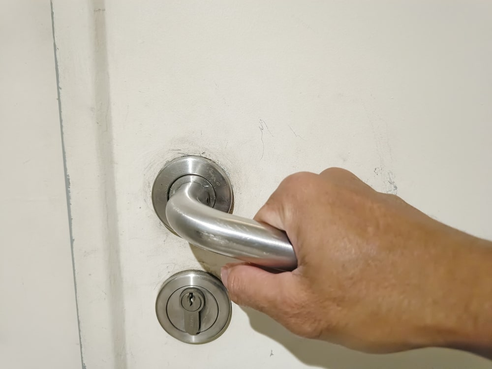 The iron handle was icy cold, biting at his skin. For a moment, he hesitated, wondering if he should turn back and lock himself in.