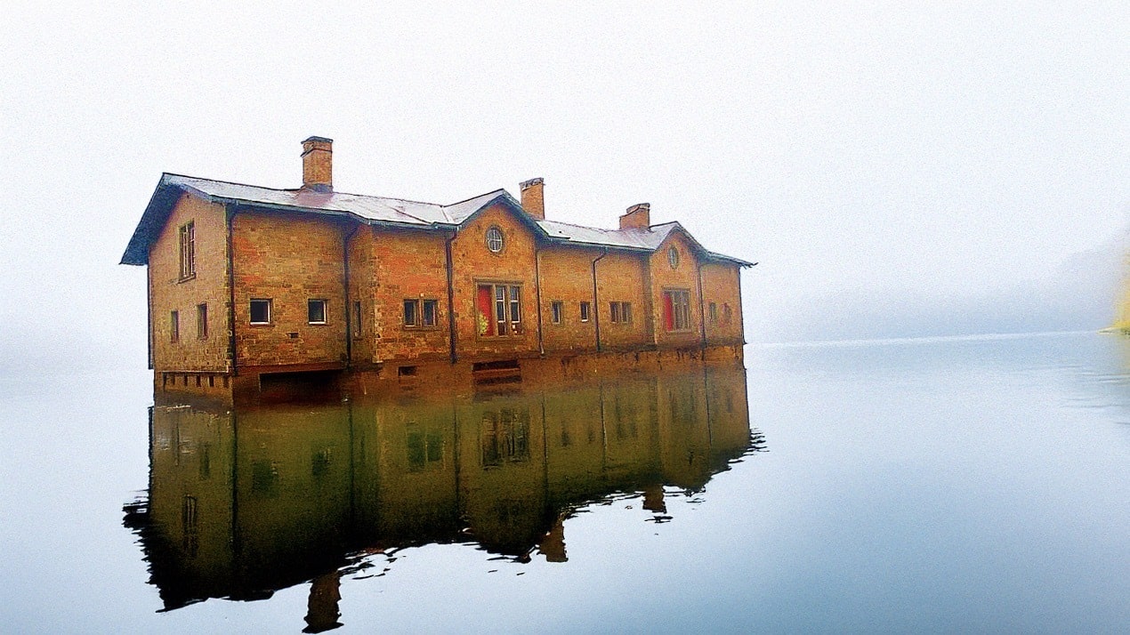 An enormous mansion floated alone on the still lake, towering above the water. He parked nearby and looked for someone who might explain it.
