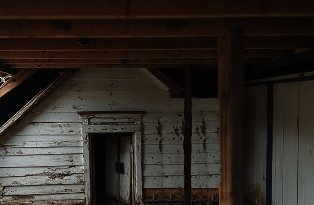 A slanted roof pressed nearly against the attic beams above it. The scale felt impossible. “This, this shouldn’t be here.”