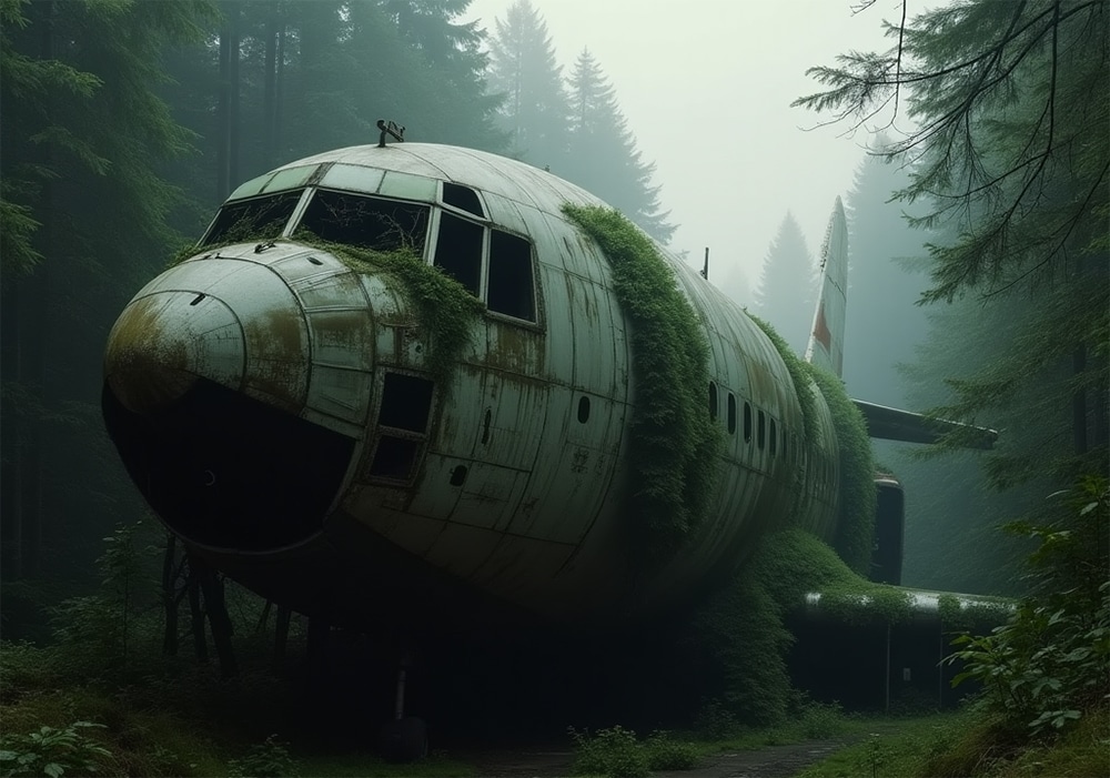 They pushed through the underbrush, branches clawing their arms until the object came into full view. Both men froze. Before them loomed an enormous, decaying plane half-buried in the earth.