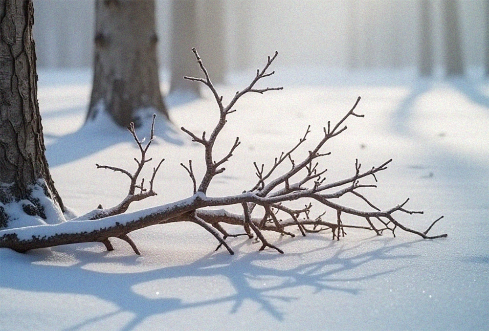 Alice scanned the area and quickly spotted a sturdy-looking branch lying beside an old birch tree, half-buried in the snow. She picked it up, testing its strength with both hands. The wood felt fresh and not brittle, which was a good sign, but she knew that she still had to be careful.