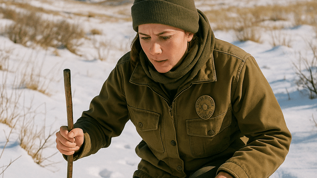 Alice noticed something odd in the snow ahead—a set of footprints she hadn’t seen before. They were fresh, pressed deep into the snow, and headed in the direction of the sound. She bent down for a closer look, feeling how soft and recently packed the snow was around the tracks.