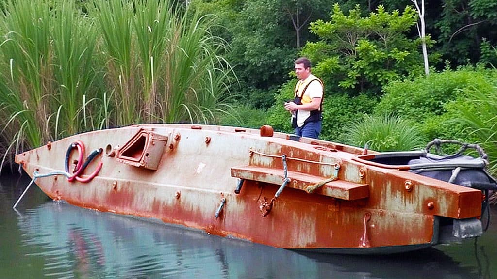 This man made a huge discovery in a local pond just outside of town. The body of water was previously used for fishing, but had been closed off for some time. And when he went out to take a look, he discovered why. He found this strange, rusted boat floating sideways in it. But what he discovered inside left him instantly speechless.
