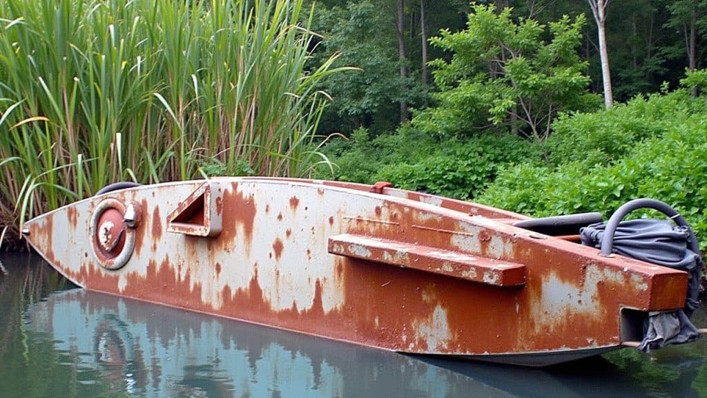As he reached the side of the rusted vessel, Bob studied its battered hull and odd metal fixtures up close.