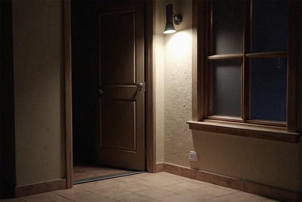 The burglars froze for a moment, then bolted for the door, shoving each other in their rush to escape. They left the front door swinging open behind them.