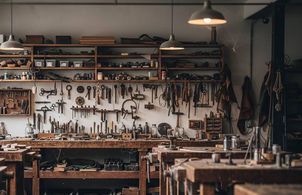 Along workbench ran the length of the back wall, every inch of it crowded with intricate tools and loose hardware.