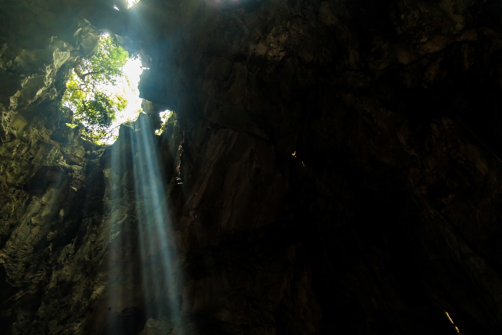Als sie nach oben blickten, bemerkten sie ein Loch in der Höhlendecke, das den Blick auf die Waldoberfläche jenseits des Berges freigab.