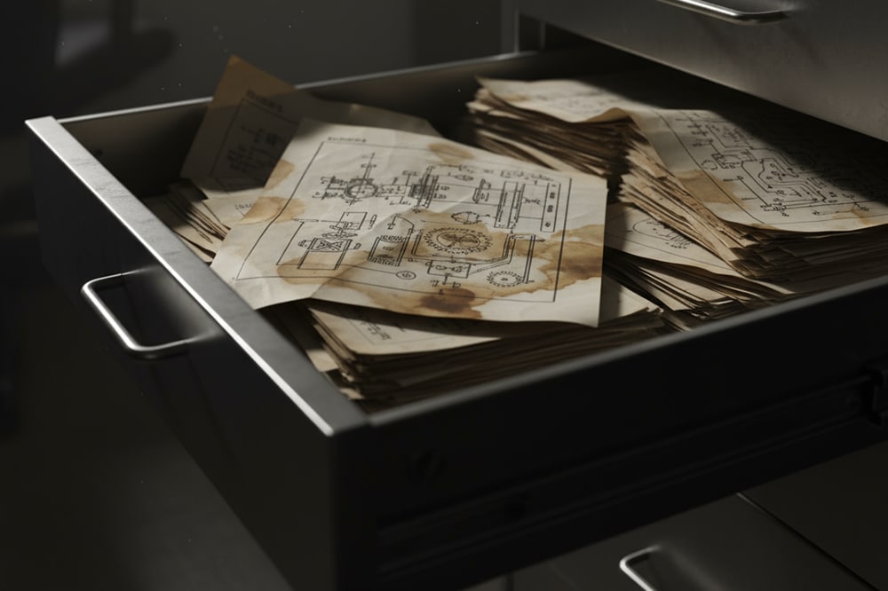 They continued searching, finding paperwork in a metal drawer. Most of the pages were water-damaged, but a few diagrams remained.