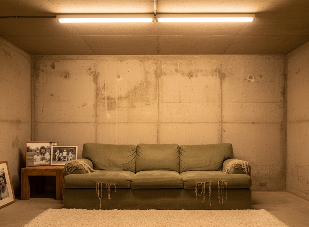 Eli wandered deeper into the bunker, surprised by what he found next. The concrete walls gave way to a cozy living room, complete with a worn sofa, a soft rug, and even family photos on a side table.