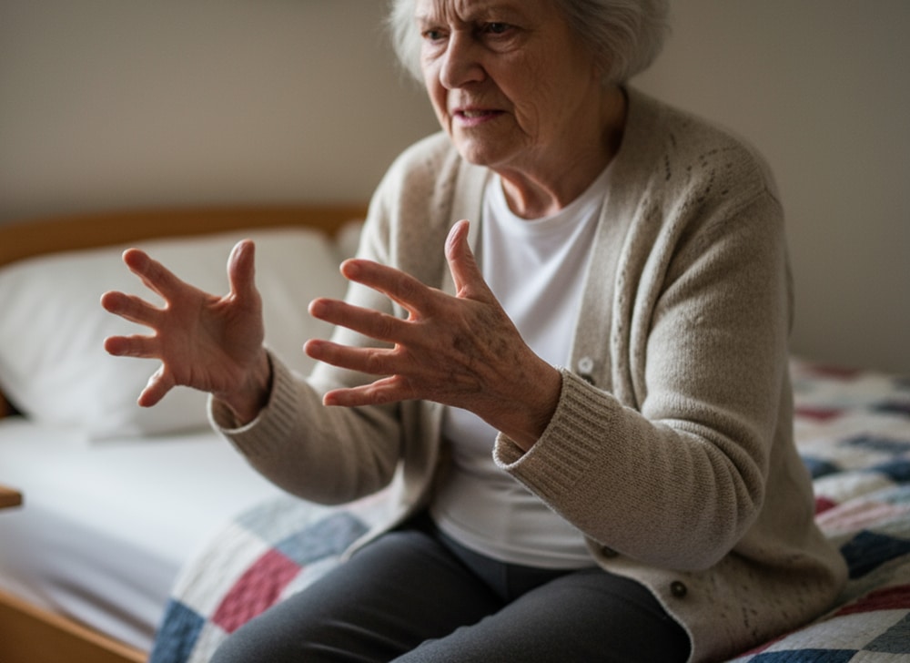 She sat on the edge of the bed, arguing quietly with the man, who listened and replied in a low, steady voice before closing the door behind him.