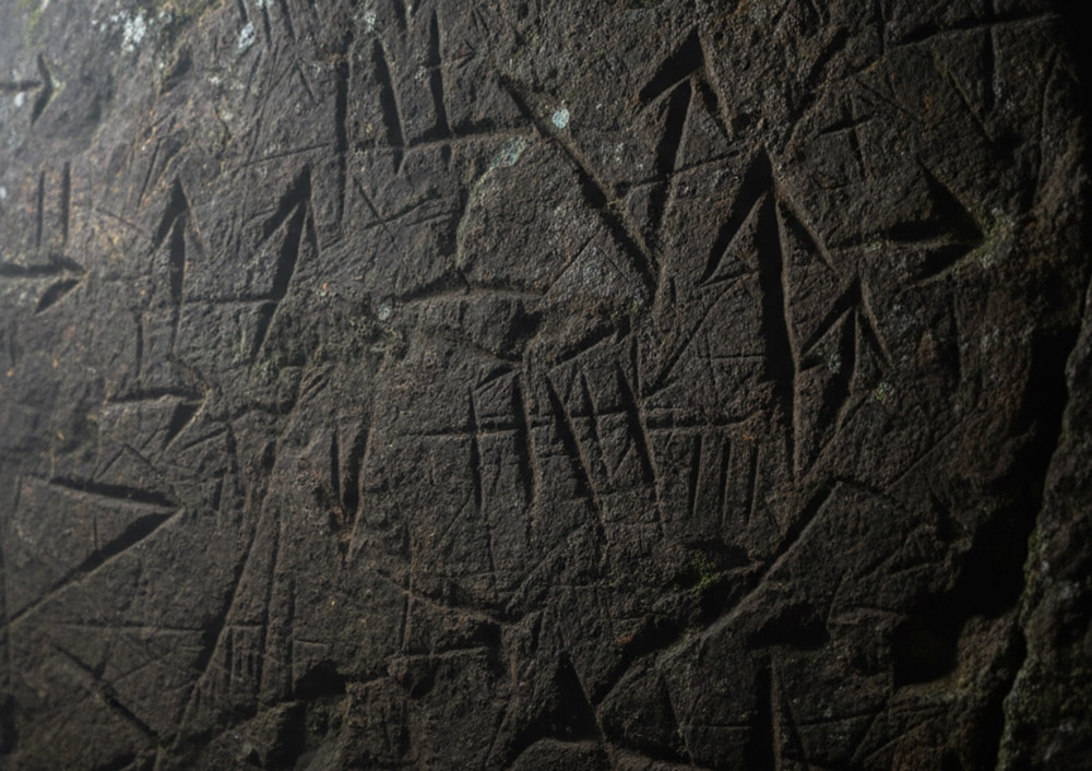 Auf halbem Weg nach oben blieb Andrew stehen und zeigte auf seltsame, absichtlich in den Stein geritzte Zeichen. Einige sahen aus wie Strichmännchen, andere wie krumme Pfeile.