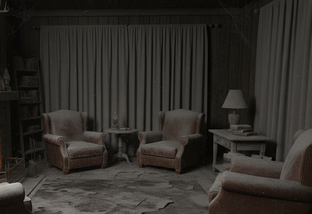 A pair of slippers rested neatly by a threadbare rug, and a mug sat beside a battered armchair.