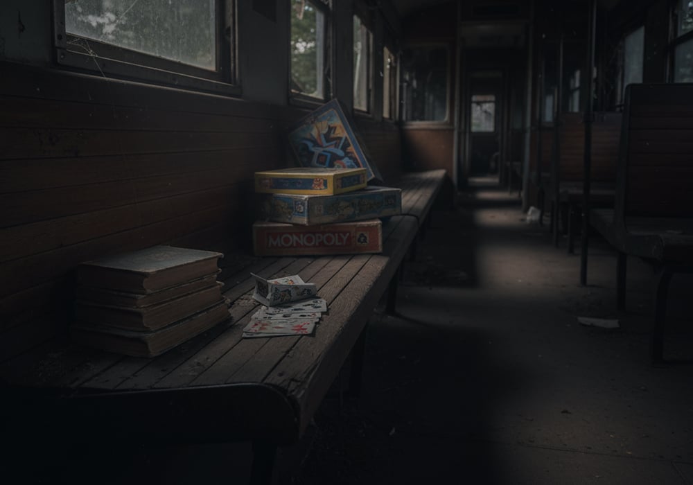 In der Nähe lagen Brettspiele, so dass sich der Raum seltsam heimisch anfühlte. Das sah nicht mehr wie ein vergessener Zug aus. Jemand hatte hier gelebt und versucht, ihm das Gefühl von Normalität zu geben.