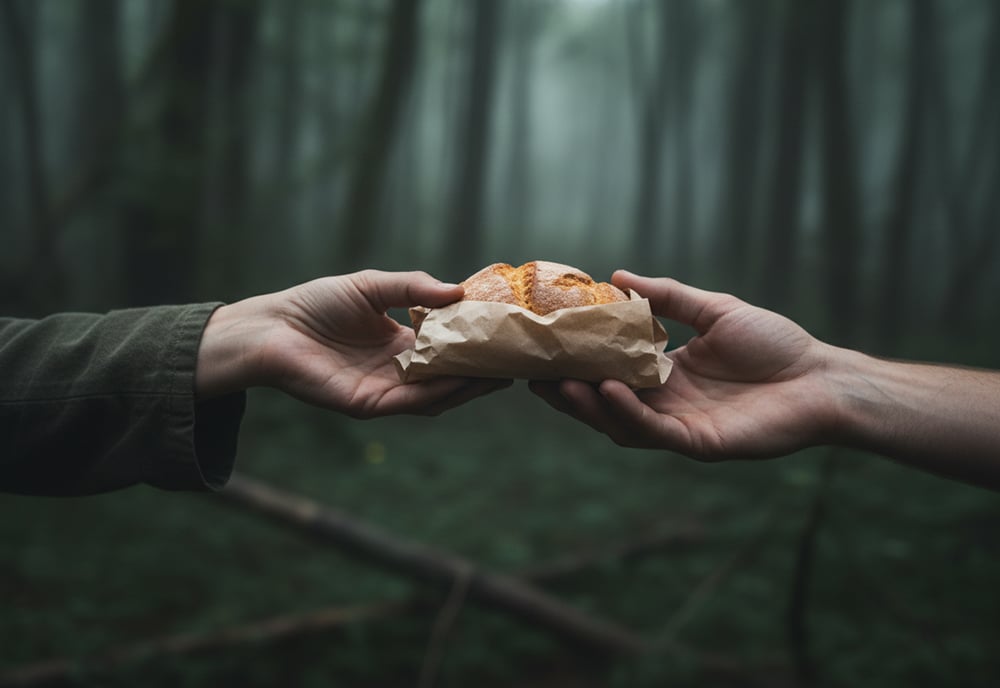 Das Mädchen, das nun lächelte, reichte ihm ein kleines Stück Brot, das in ein Stück Papier für den Weg eingewickelt war. Er versprach erneut aufrichtig, dass ihr Geheimnis bei ihm sicher sei.