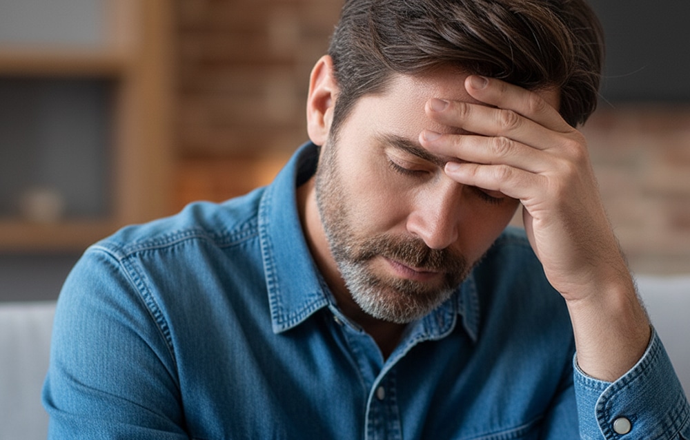 Mark sat down on the edge of the couch, still holding the bear. He looked at Laura with wide, uncertain eyes.