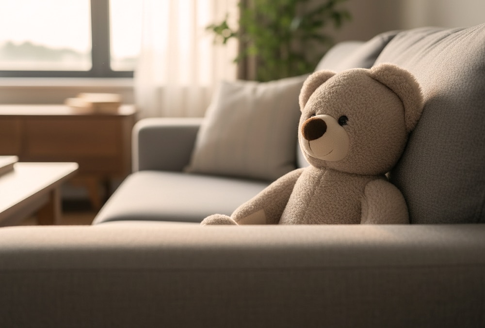 When Laura got home, she placed the teddy bear on the couch in the living room. The soft light from the window made its fur look almost new.