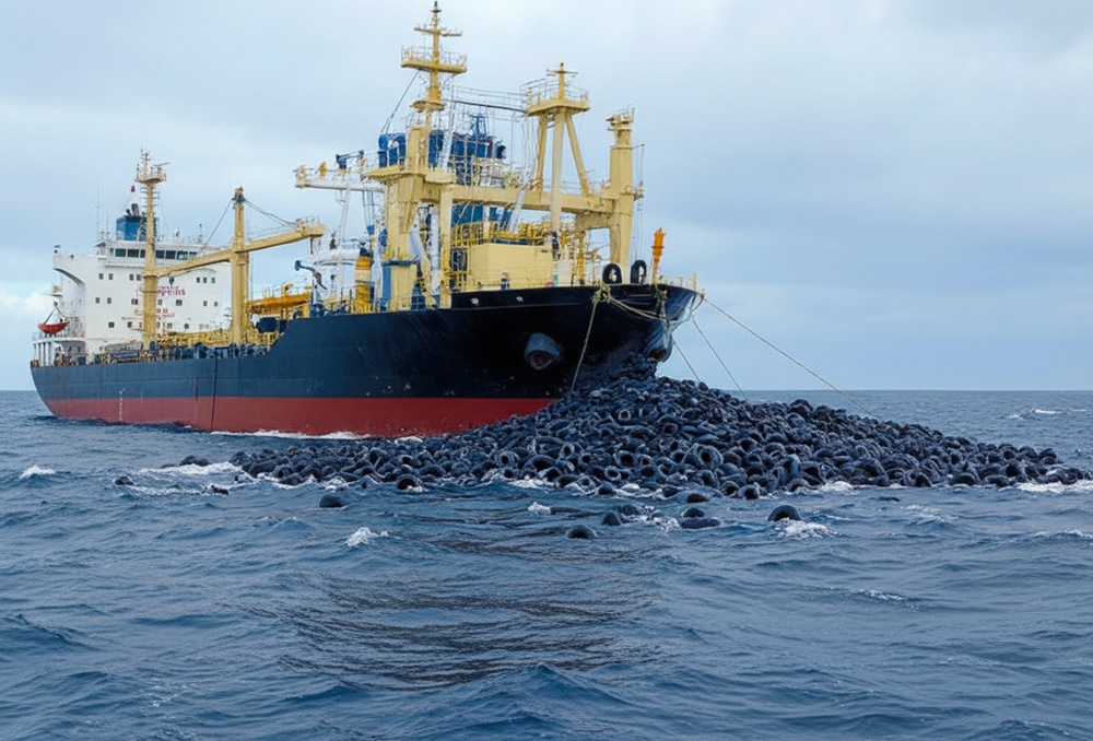 “Disposing? What was it disposing?” The fisherman explained that the large ship was carrying thousands of rubber tires and was throwing them into the ocean for some reason.