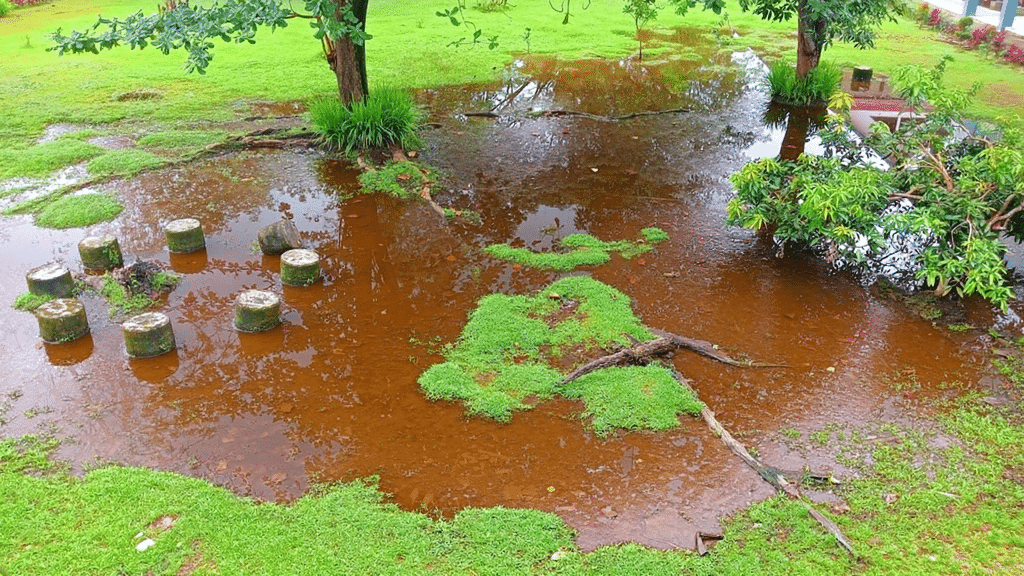 The sludge spread out like a foul-smelling pond in their once-peaceful garden.