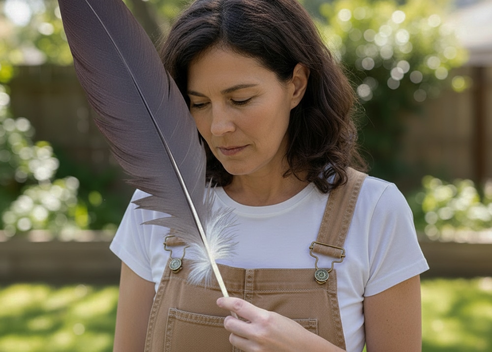 Hannah murmured some soft, inaudible words to herself while inspecting. She then sniffed the feather, rubbed the shaft between her fingers, and shook her head.
