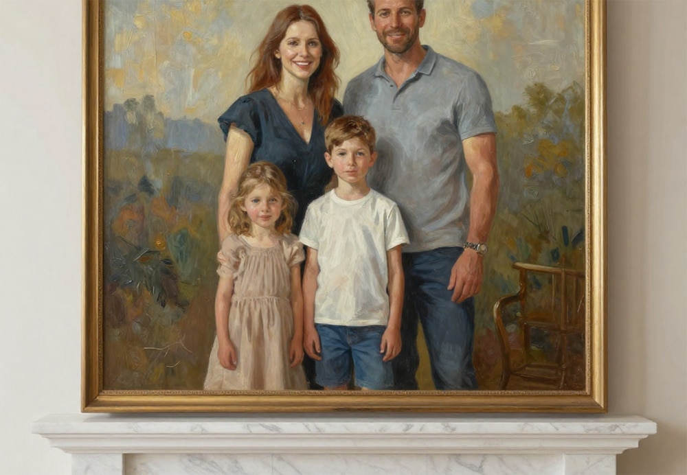 Above the mantle, a large painted portrait drew their eyes. It showed a man in a neatly ironed blouse, a woman at his side, and two children leaning affectionately against their parents’ legs.