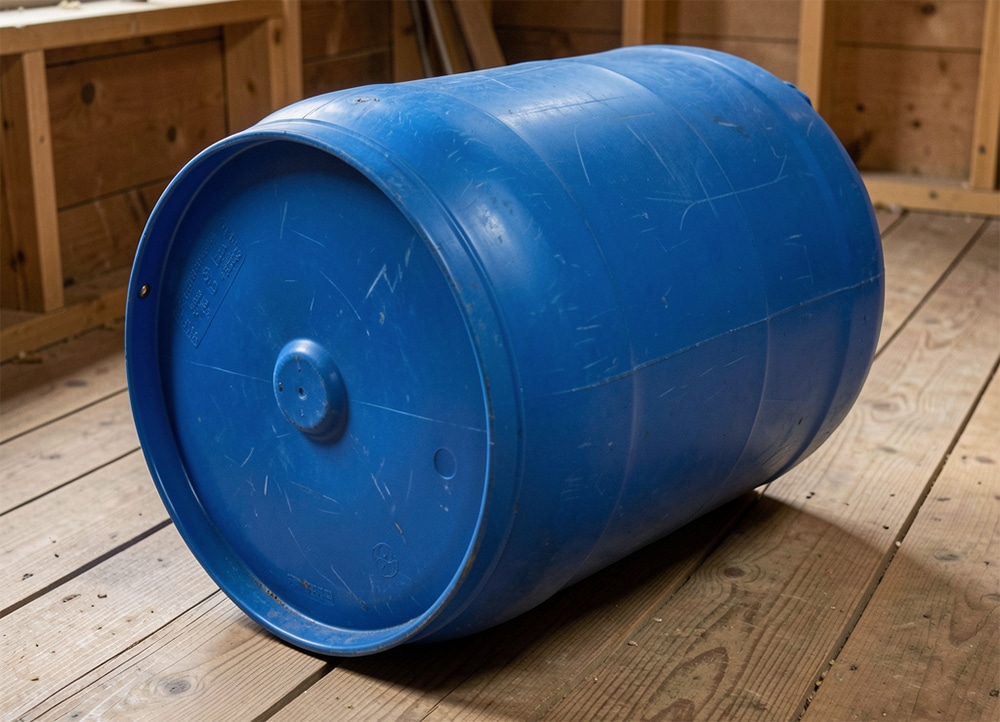 John hurried to the shed, dragged out an old plastic barrel, and rolled it to the garage.