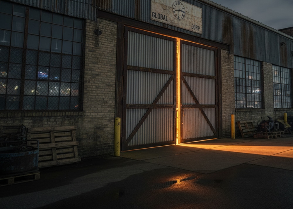 The building loomed ahead, utilitarian and plain. Its door was ajar, left open in the chaos. Brian paused, scanning the yard for the men.