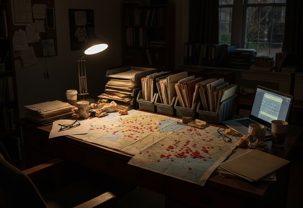 Finally, Brian reached the desk. The surface was a mess of paper, open bins, and maps covered with red dots.
