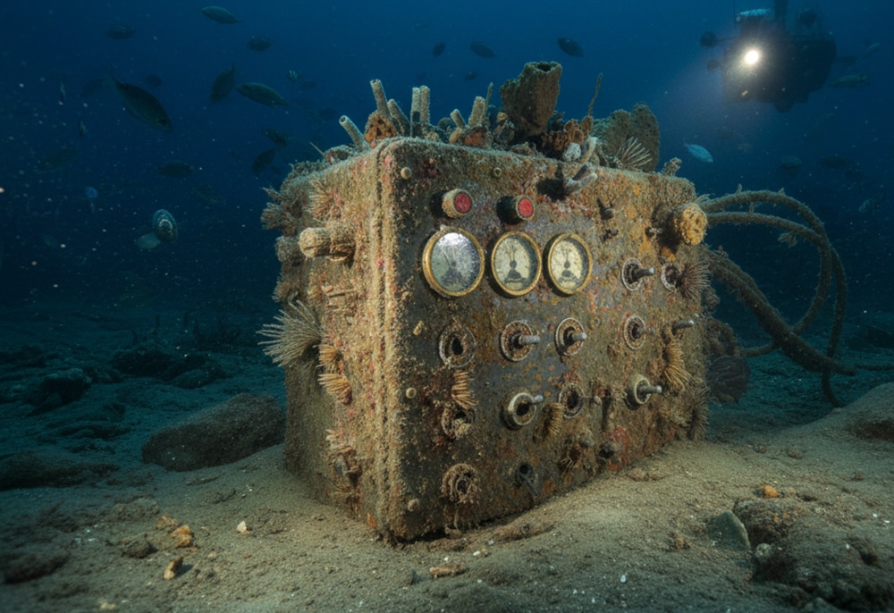 Sam examined the cables running into the hatch, tracing them back to a weathered control box partially buried in silt. He brushed it off, revealing a cluster of dials and switches.