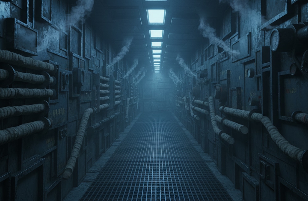 A narrow corridor stretched ahead, lit by pale blue overhead panels. The walls were a patchwork of welded metal and insulated piping.