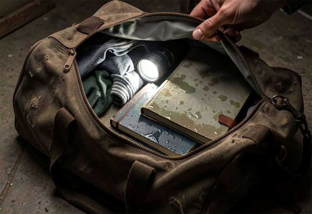 Sam knelt and opened the duffel, revealing clothes, a flashlight, and a waterlogged notebook. He handed it to Claire.