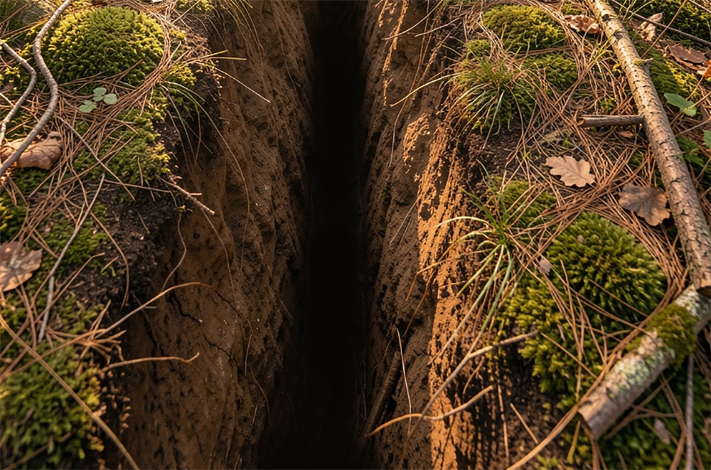 Emma knelt down, peering closer. There, partly hidden by shadows and brambles, was a narrow crevice in the earth, no more than a few feet wide.