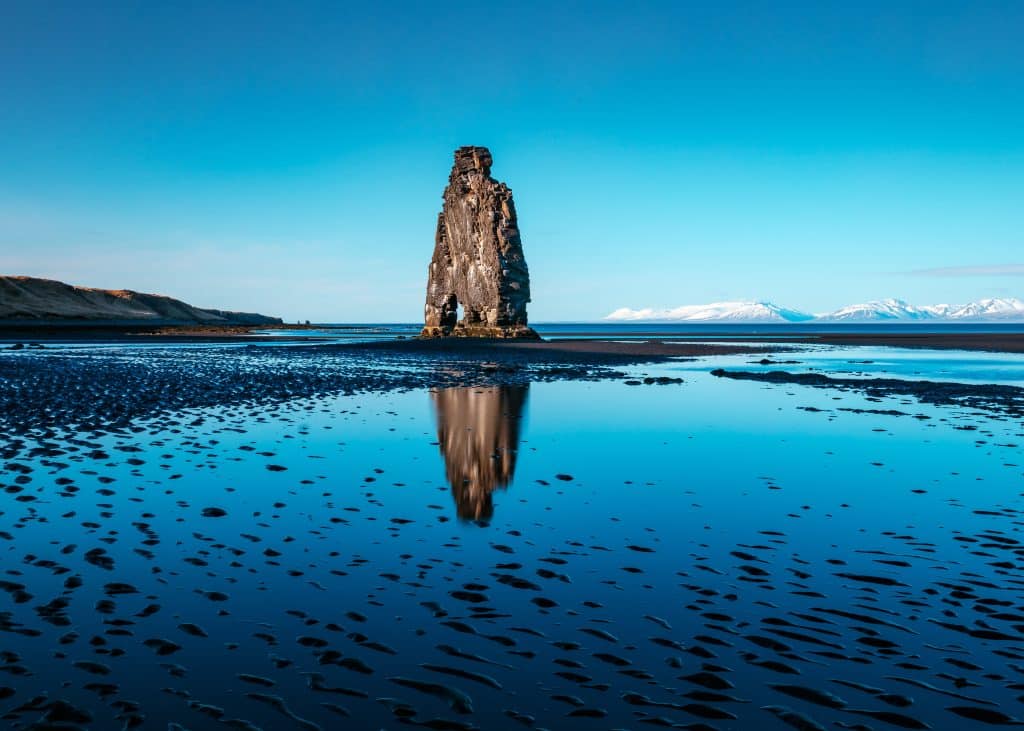 A beautiful shot of a single rock in the middle of a lake with reflection in the water and clear blue sky